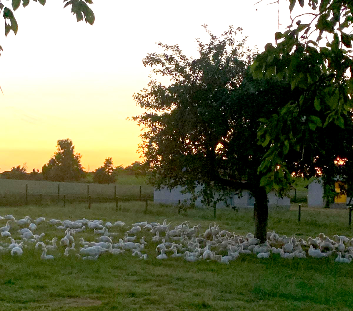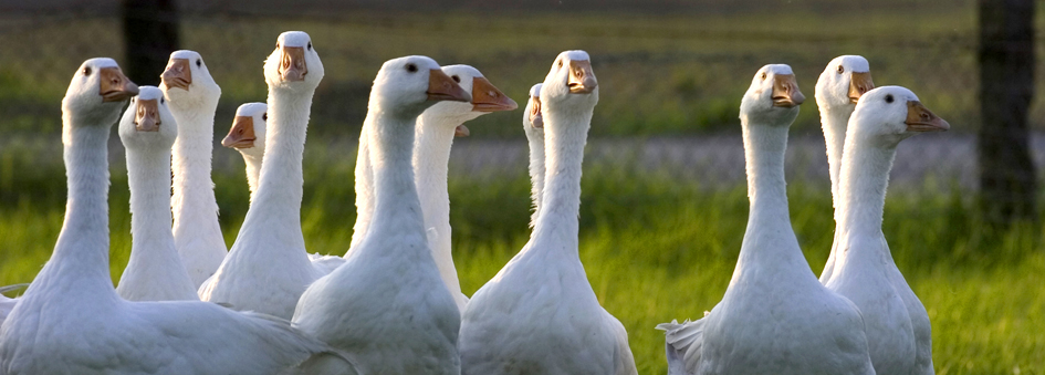 Die mittelschweren und schweren Mastgänse, Dänische Kreuzungen, zeichnen sich durch ein besonders gutes Fleisch/Fettverhältnis aus. Bei dieser Züchtung standen folgende Kriterien im Vordergrund: Weißes Gefieder (Gefiederverwertung), günstiges Fleisch/Fettverhältnis, breite Brustauflage bei flachen Brustknochen sowie das Gewicht des Endproduktes. Weiterhin ist zu erwähnen, dass unsere Zuchttiere einen hohen Gesundheitsstatus haben. Maximale Herdengröße 300 Tiere. Dadurch erreichen wir bei den Küken eine besonders hohe Vitalität bei geringen Ausfällen. Unsere Mastgänse werden ausschließlich mit hofeigenem Getreide medikamentenfrei aufgezogen. Dies ist unsere Grundmaxime unserer Gänseaufzucht.