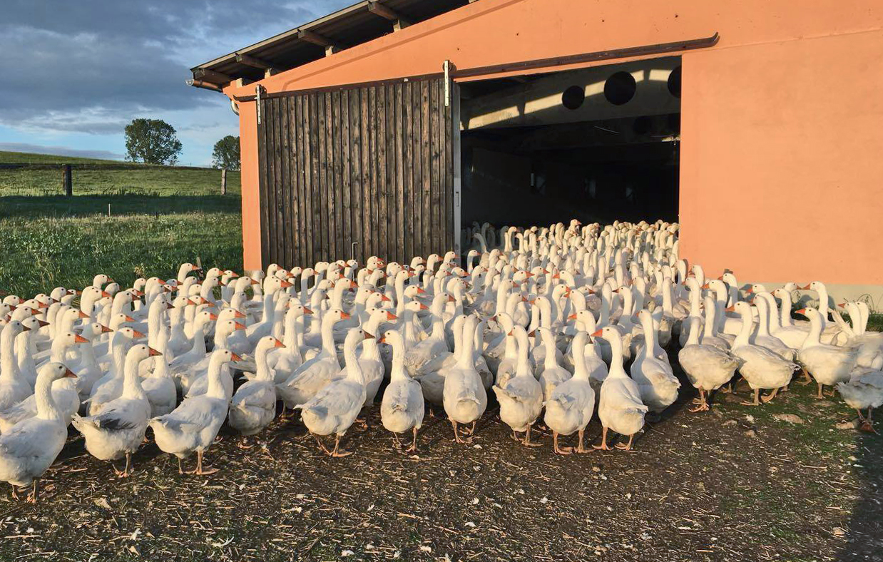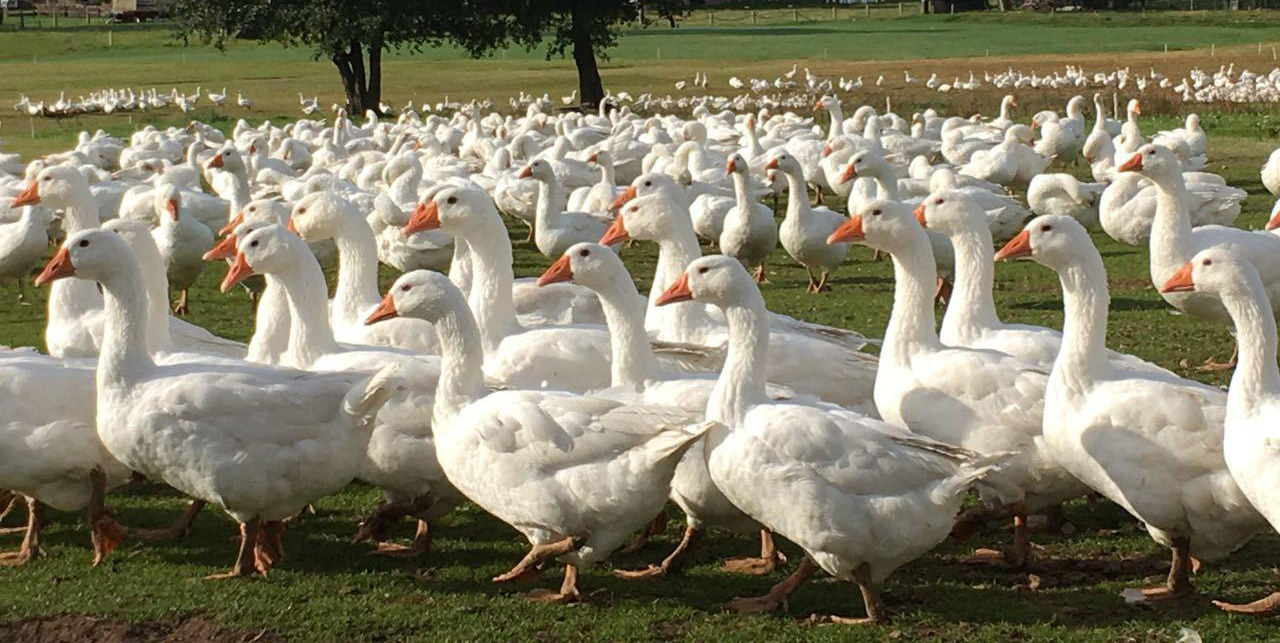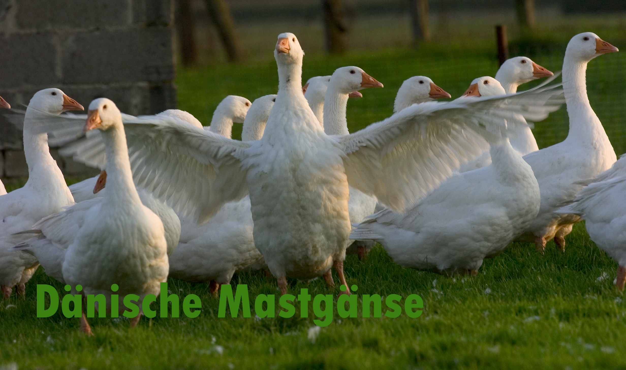 Die mittelschweren und schweren Mastgänse, Dänische Kreuzungen, zeichnen sich durch ein besonders gutes Fleisch/Fettverhältnis aus. Bei dieser Züchtung standen folgende Kriterien im Vordergrund: Weißes Gefieder (Gefiederverwertung), günstiges Fleisch/Fettverhältnis, breite Brustauflage bei flachen Brustknochen sowie das Gewicht des Endproduktes. Weiterhin ist zu erwähnen, dass unsere Zuchttiere einen hohen Gesundheitsstatus haben. Maximale Herdengröße 300 Tiere. Dadurch erreichen wir bei den Küken eine besonders hohe Vitalität bei geringen Ausfällen. Unsere Mastgänse werden ausschließlich mit hofeigenem Getreide medikamentenfrei aufgezogen. Dies ist unsere Grundmaxime unserer Gänseaufzucht.